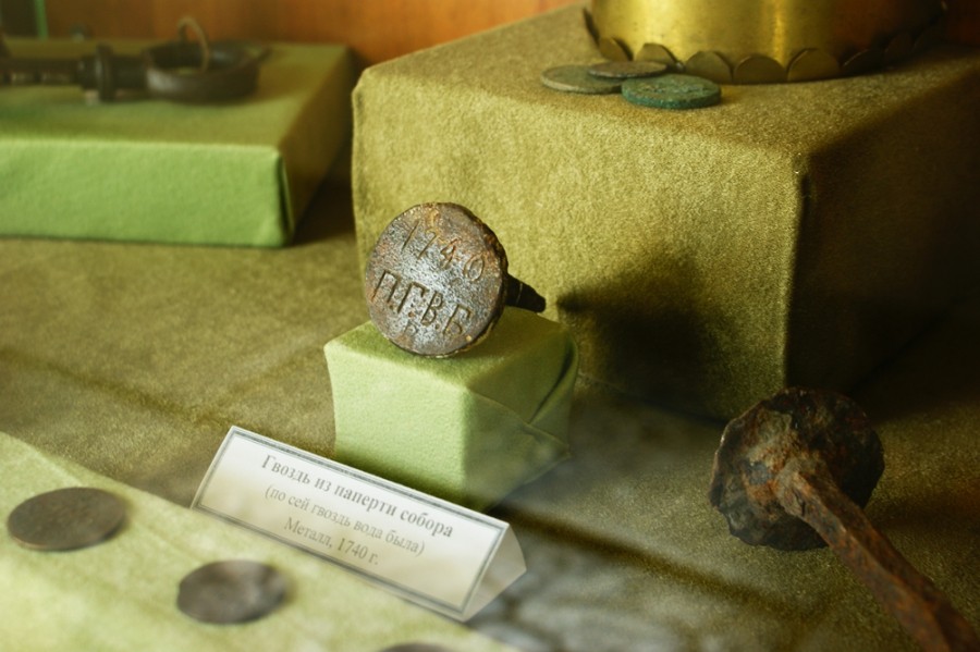 1740 год. Большая вода была названа «Таракановской», в память о ней «вбит в соборную стену бударный гвоздь». На нем отметка «1740. П. Г. В. Б.», что означает: «В 1740г. по (сей) гвоздь вода была». Высота подьема воды – 4,72 метра.